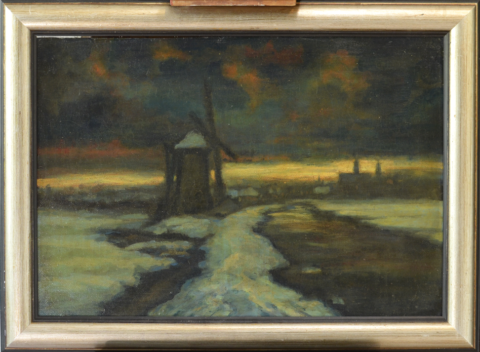 Wippersmolen Maassluis, in winteravondstemming [ 51,925189°N 4,266434°O ri.245° ] | olieverf op hardboard 70x48cm | © Henk Fortuin Maassluis 1958 (Collectie Museum Maassluis 06178)