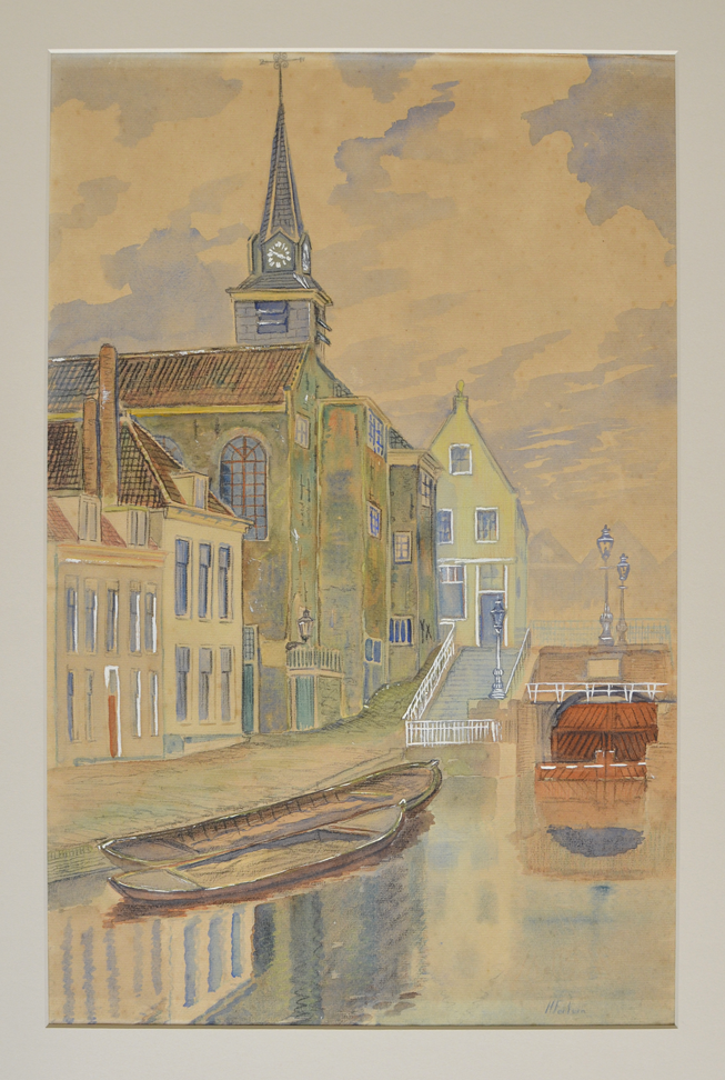 Veerstraat met Kleine Kerk en Monsterse sluis, Maassluis, [ 51,922335°N 4,253312°O ri.222° ] | aquarel/gouache 31x48cm | © Henk Fortuin Maassluis 1955 (Collectie Museum Maassluis 08771)