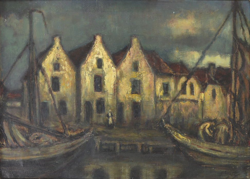Visserschepen in de Zuidgeer, Maassluis; historische fantasie [ 51,9198°N 4,2545°O ri.38°] | olieverf op linnen 70x50cm | © Henk Fortuin Maassluis 1965 (Collectie Museum Maassluis 09373)