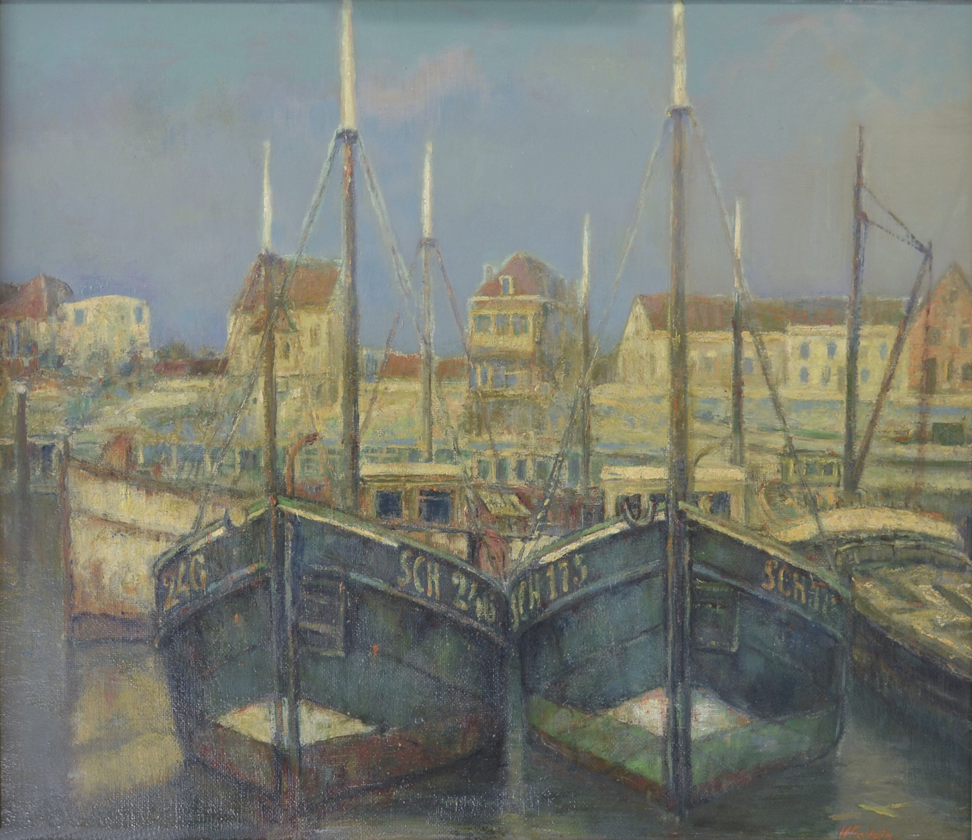 Schepen in de Noordgeer, Maassluis [ 51,218387°N 44940811°O ri.38°] | olieverf op hardboard 70x60cm | © Henk Fortuin Maassluis 1965 (Collectie Museum Maassluis 11456)