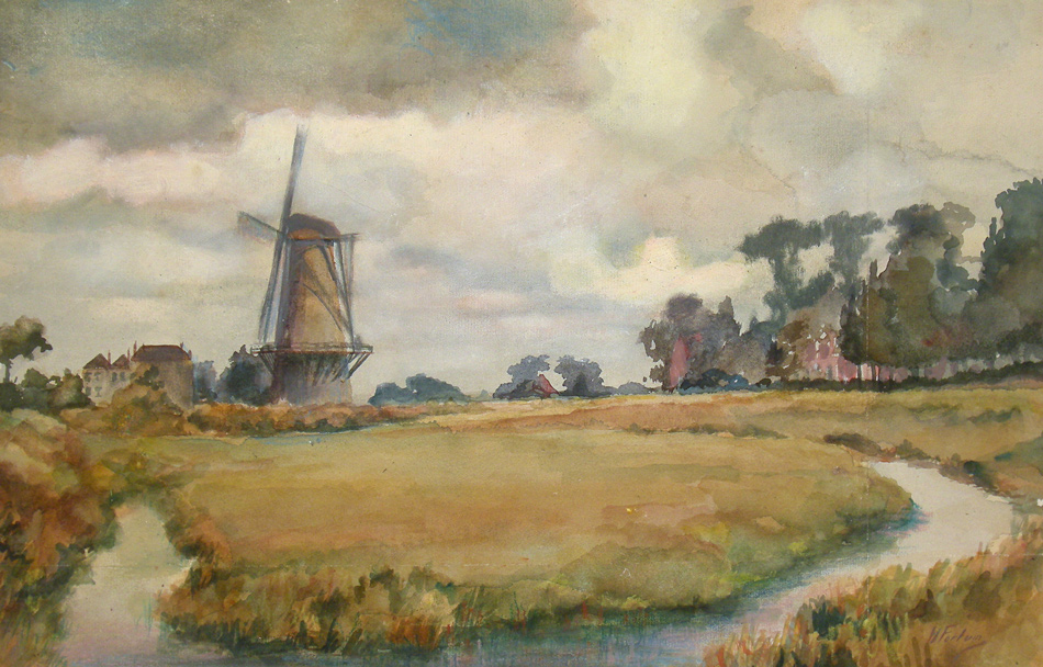 Maassluis Taanschuurpolder, korenmolen De Hoop [ 51,91781°N 4,2520° ] | aquarel 48x30cm | © Henk Fortuin Maassluis 1943 (particulier bezit)