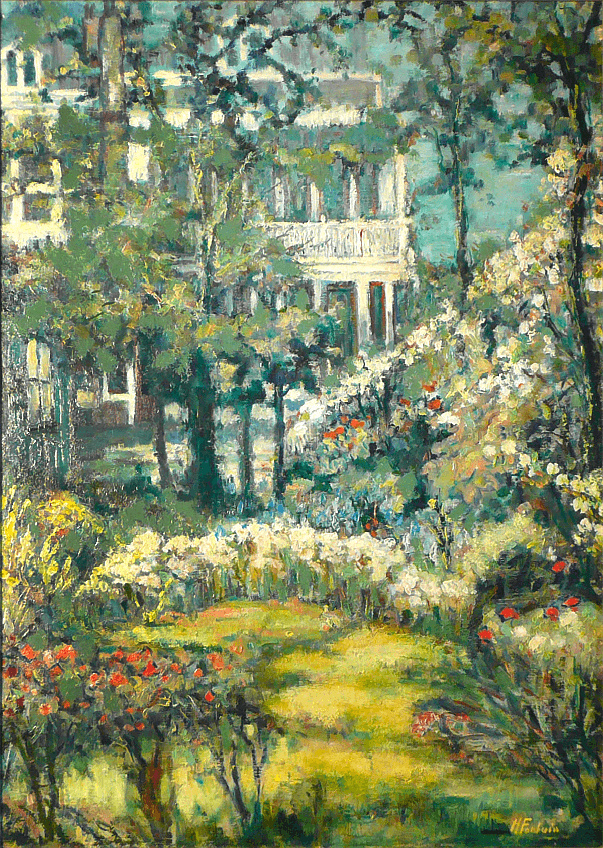 Bloementuin [ 51,916410°N 4,248547°O ri.305°] | olieverf op linnen 49x69cm | © Henk Fortuin Maassluis 195. (Particulier bezit)
