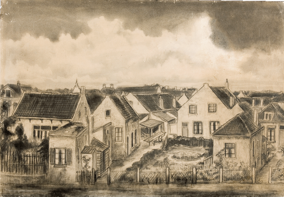 Maassluis Bloemhofje I Jokweg [ 51,9205°N 4,2548°O ] | conté op papier 49x35cm | © Henk Fortuin Maassluis 1955 (collectie Museum Maassluis)