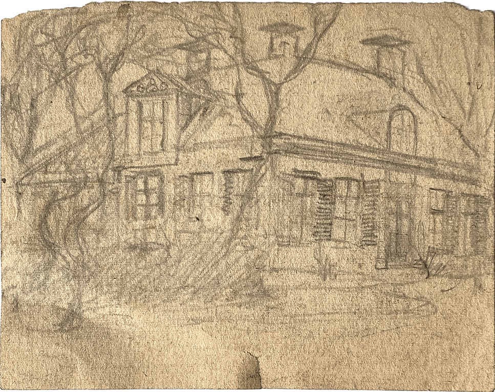 Op de achterkant van een pamflet maakte Henk een schets van de pastorie in Nes, waar hij vanaf halverwege 1944 verbleef – potlood op papier